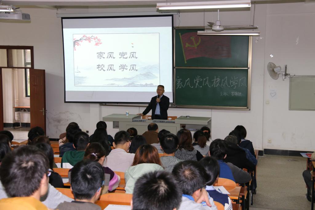 副校长罗锦银同志在8F-T101教室开展了以《家风 党风 校风 学风》为主题的专题党课报告会。出席此次报告会的有机关党委校友会支部和资产与后勤管理处支部、四虎