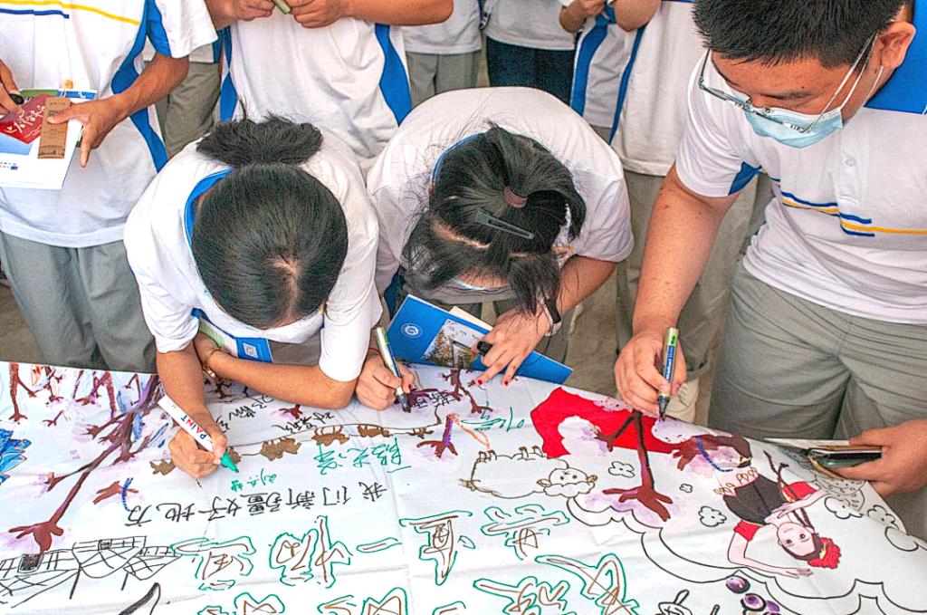 民族团结一家亲,各民族要像石榴籽一样紧紧的抱在一起。实践团成员和精河高中学生共画一副新疆棉爱国画,共同表达浓浓的爱国之情。同学们非常有想法,并在画上写下民族团结的字样。此外,同学们还通过明信片与纺大学子来了一场“隔空对话”,传达着彼此的想法和祝福。