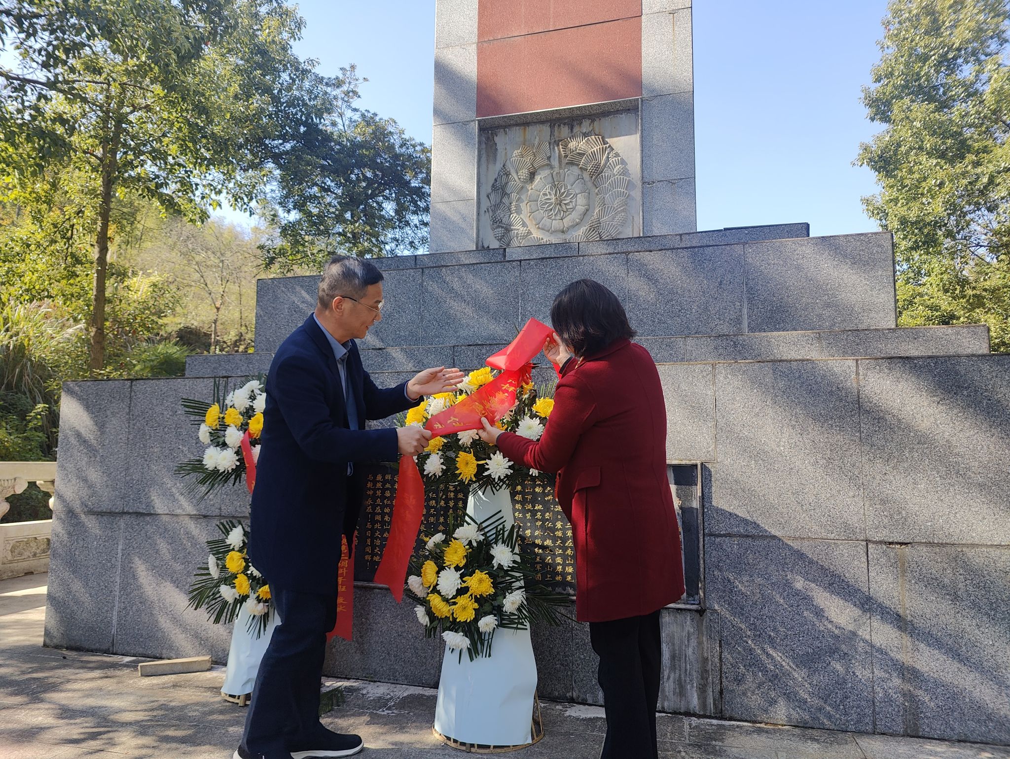 在革命烈士纪念碑前,党员同志们整齐列队,院党委书记陈桂枝和党委委员、院长王罗新代表党员同志向革命烈士敬献花篮,并在党委副书记魏剑带领下重温入党誓词,表达对革命先烈的缅怀之情和崇高敬意。