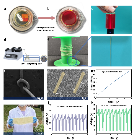 回收和重新设计的挑战对大规模生产构成重大障碍,特别是对产生高生产成本的芳纶基材料。在这里,ANFs/TBTO膜是由去离子水的质子诱导氢键自组装而成的。形成叔丁醇钾(KTB)/DMSO溶液的甲醇钾(图1)再次从ANFs/TBTO分子链上剥离酰胺键中的氢键,使ANFs/TBTO膜去质子化。通过湿法纺丝得到的再生ANFs/TBTO纤维呈淡黄色,且表现出显著的抗拉强度和显著的柔韧性,进一步加工并编织成织物后,仍可用于能量收集。(图3)