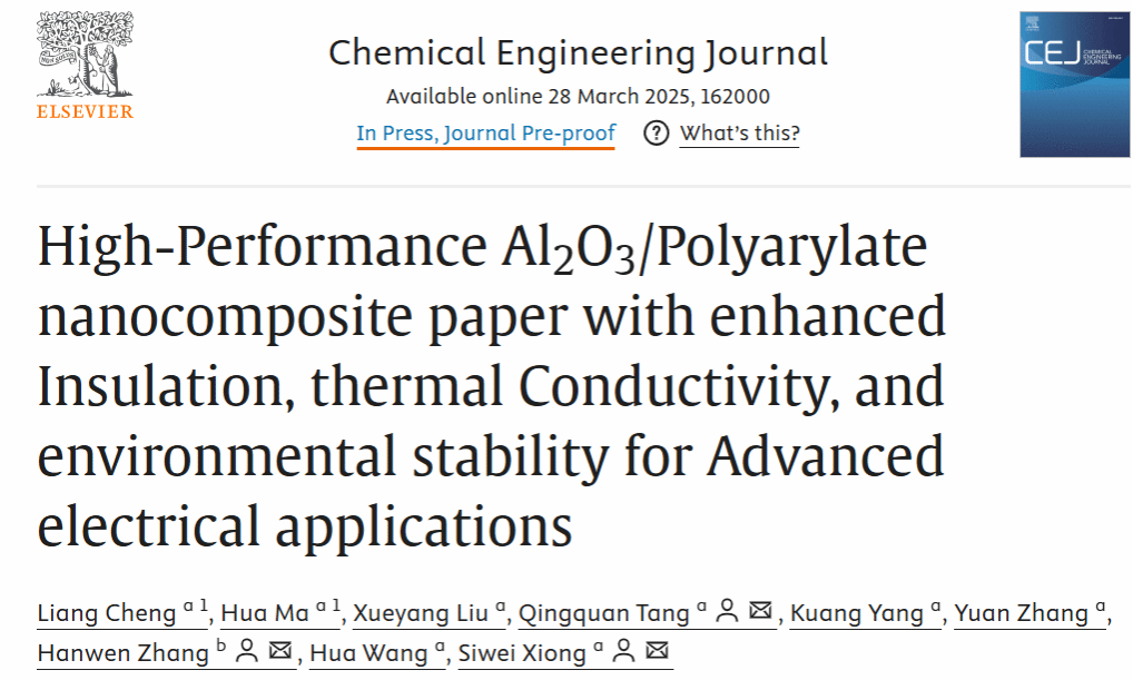 王桦/王罗新教授团队本科生程亮以第一作者在国际化工领域权威期刊《Chemical Engineering Journal》(中科院一区TOP,影响因子 13.4)上发表了题为“High-Performance Al2O3/Polyarylate nanocomposite paper with enhanced Insulation, thermal Conductivity, and environmental stability for Advanced electrical applications“的学术论文。四虎