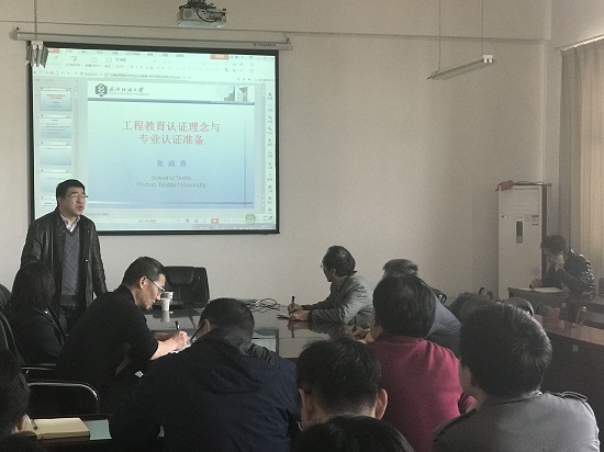 在学院会议室举行了工程教育认证专题辅导讲座,纺织学院党委书记、院长张尚勇教授受邀主讲。全院教职员工参加讲座集中进行学习。