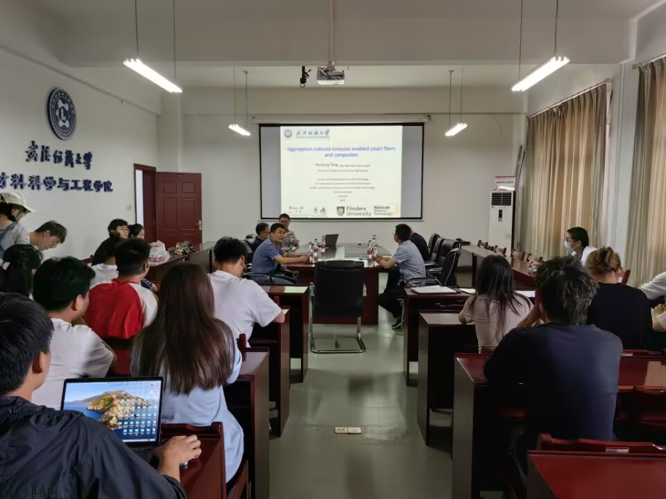 高效吸附课题组邀请,以“Aggregation induced emission enabled smart fibers and composites”为题进行了专题报告,报告由刘欣副院长主持,国重副主任杨应奎教授、课题组全体成员以及纺织学院的部分教师应邀参加会议。