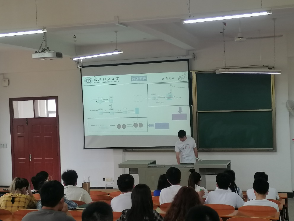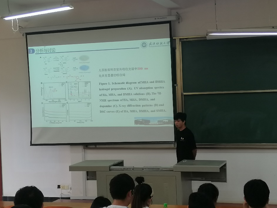 彭松林、范朋珲、李钰山三位同学分别给学院全体研究生作以“纳米纤维增强水凝胶的制备及其传感性能研究” 、“改性透明质酸作为组织粘合剂用于伤口止血”和“Liquide-like nanofluid mediated modification of solar-assisted sponges for highly efficient cleanup and recycling of viscous crude oil spills”为主题的三场专题报告。