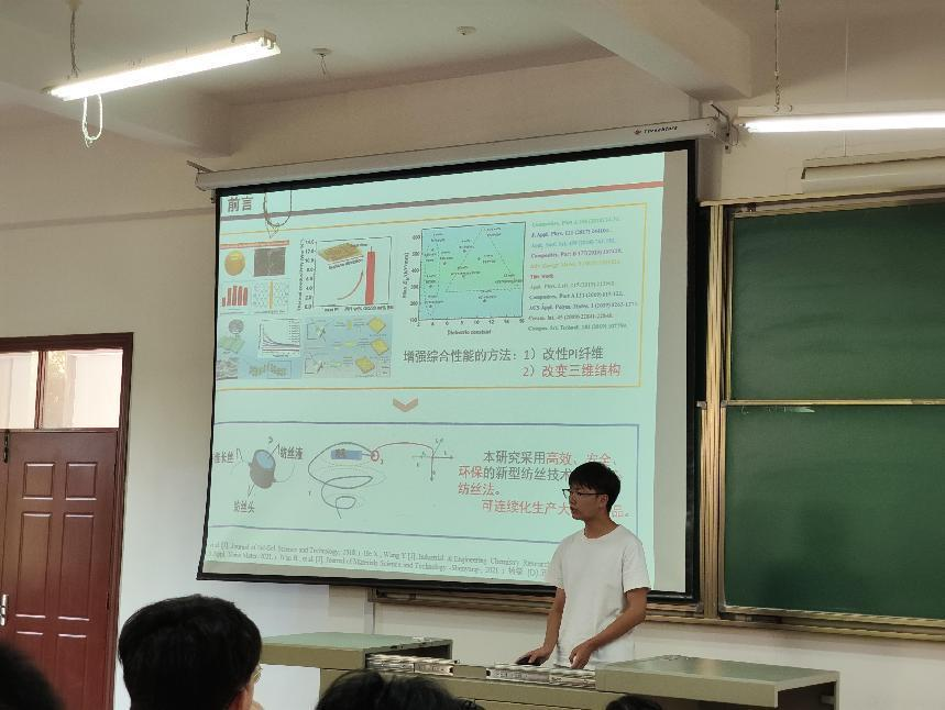 李星、钟佳锦、张博文三位同学分别给学院全体研究生作以“离心纺制备聚酰亚胺纤维纸及其绝缘性能研究”、“ZrO2/Si-C-O多相柔性陶瓷纳米纤维的制备和性能研究”和“干法离心纺PVA/CMCS复合纤维膜的制备及其性能研究”为主题的三场报告。