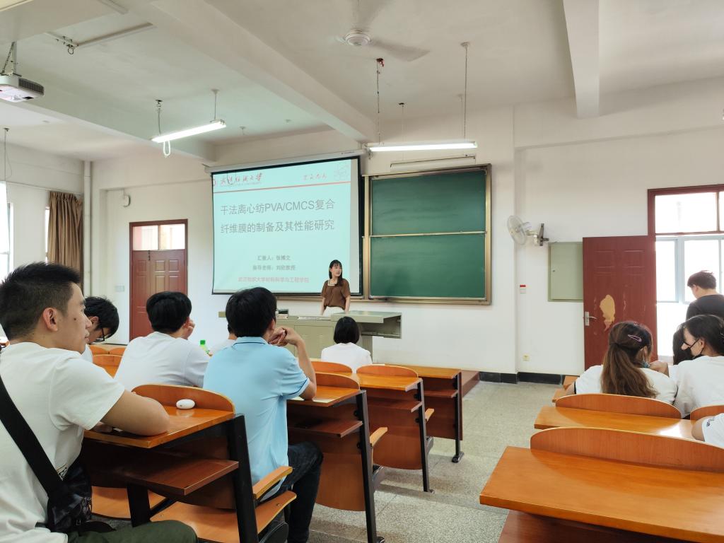 首先张博文同学介绍了聚干法离心纺PVA/CMCS复合纤维膜的制备及其性能研究的相关内容,离心纺丝后PVA/CMCS以及PVA溶液中,流变性能的特点,通过一系列数据找到最合适的离心温度。以及介绍了CMCS的无毒性却能起到抗菌作用。