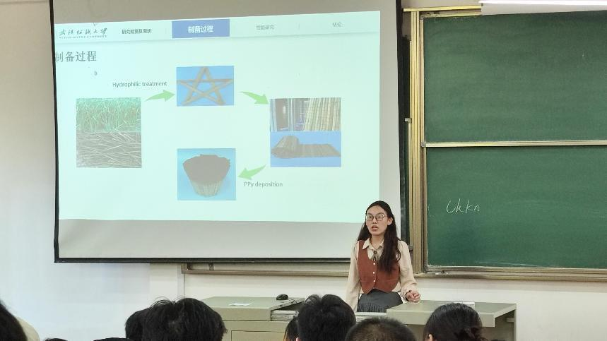 孙艳、王朝荣、张珊三位同学分别给学院全体研究生作以“PPy@HCL竹简式太阳能光热蒸发器”、“Polylactic acid scaffold with directional porous structure for large-segment bone repair”和“硫化钼复合石墨烯锂电子电池负极材料的制备及其性能”为主题的三场专题报告。