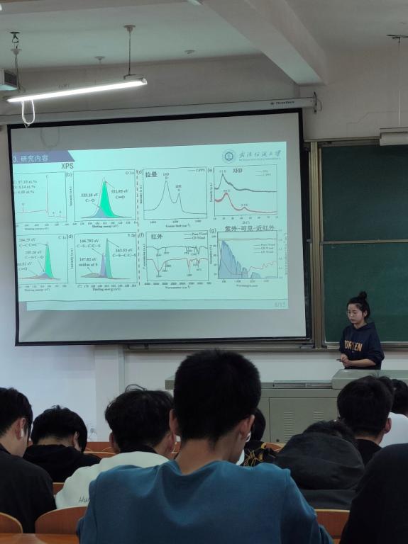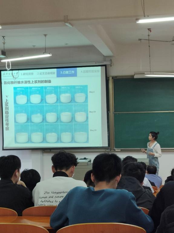 罗飘、付露、周祥三位同学分别给学院全体研究生作以“氮化物纤维上浆剂的制备及纤维表面处理改性的研究”、“木材基光热水蒸发器件的制备及性能研究”和“聚六亚甲基双胍/纤维素/聚乳酸纤维复合抗菌纸的简易制备工艺“为主题的三场专题报告。