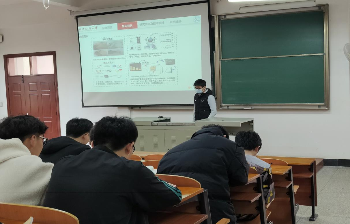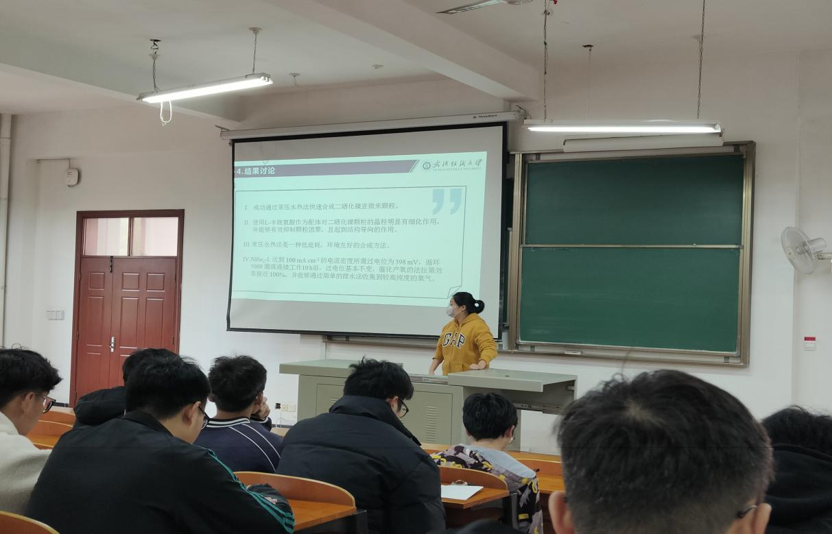 许晓轩、万华坤、尧智三位同学分别给学院全体研究生作以“常压水热法简易合成二硒化镍颗粒用于碱性析氧反应”、“表面功能化纤维膜用于细菌特异性、快速、高灵敏检测研究”和“纳米纤维基高效杀菌抗病毒空气过滤材料的制备及性能研究”为主题的三场专题报告。