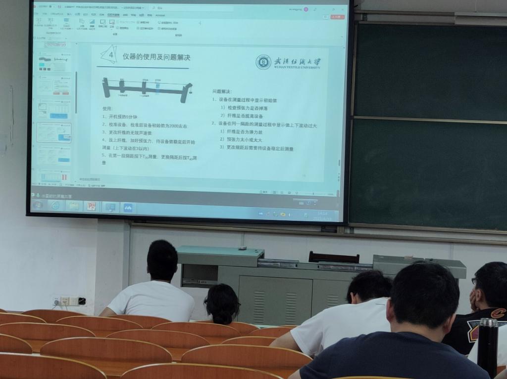 徐星颖以声速法测定纤维动态弹性模量方法标准化的研究为题,从研究背景、声速法对弹性纤维的适用性、仪器的使用及问题解决等方面展开了报告,指出基于声波周期性扰动致使纤维微小变形的声脉冲传播法测定化学纤维的动态弹性模量(声模量),在教学科研和工业领域有广泛应用,虽然是在线上进行汇报的,但仍激发了在场老师及同学们的热烈讨论。