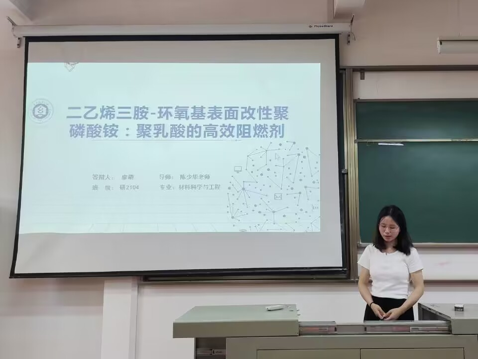 最后,廖萌同学介绍到她以二乙烯三胺(DETA)与聚磷酸铵(APP)的阳离子交换反应为基础,设计并制备了两种无机-有机-有机三层改性聚磷酸铵(APP-D-K和APP-D-E)。其中APP-D-E不仅可作为PLA低负荷下的高效阻燃剂,还可以使聚乳酸保持良好的韧性和强度
