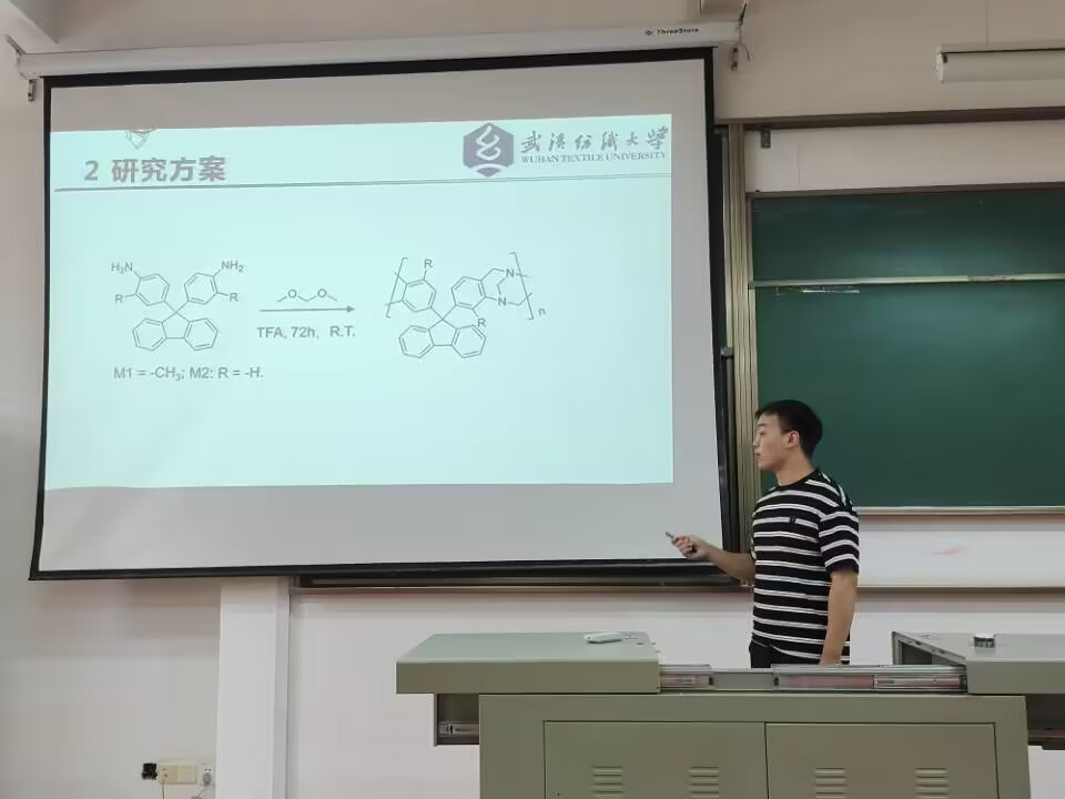 首先,陈豪杰同学以“一种用于检测金属离子的梯形聚合物荧光探针”为报告主题,着重介绍了梯形聚合物相较于单链式聚合物具有良好的热、化学和机械稳定性,在光催化、离子检测荧光器件等方面都具有广泛应用。由于梯形聚合物的刚性骨架会形成微孔结构,可以减小荧光基团——芴基团的聚集荧光猝灭效应,并且梯形微孔聚合物的比表面积比较大,还可以增加对离子的吸附。