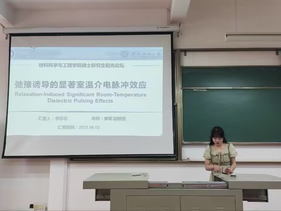 随后,李珍珍同学讲解到随着智能电子/电气系统的快速发展,对热敏介电材料的需求日益迫切。在她的研究中,证明了聚偏二氟乙烯中的结构弛豫,一种非热力学相变,可以在室温下诱导产生显著的热响应介电脉冲。她发现通过连续吹塑纺丝工艺制造的PVDF@PEG同轴纳米纤维膜可以实现显著的室温介电脉冲效应。其对弛豫诱导介电响应机制的发现,为热响应介电材料设计和制备提供了一种新的策略。
