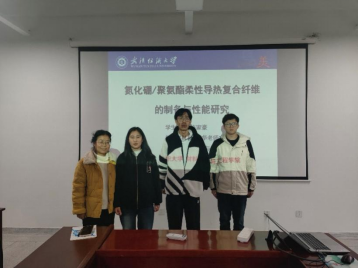 陈阿敏同学开发的柔性复合电解质通过三维网络结构设计,采用 LLZTO 无机填料与 Si-Zr-O-C 纤维膜协同改性技术,实现室温离子电导率 3.4 mS/cm,电化学窗口拓展至 4.5V,对称电池过电势低至 17mV,有效解决传统电解质界面接触与机械性能难题,为固态电池安全性能提升提供新路径。付昕明同学针对聚醚酮酮基涂料开展系统研究,通过调控对苯二甲酰氯与间苯二甲酰氯比例(6/4、7/3),结合静电喷涂与热处理工艺,制备出维氏硬度 18.5-20.6 HV、附着力 5A 级的耐酸碱涂层,相关技术已获企业委托开发新能源铜排防护解决方案。许家豪同学采用表面功能化技术增强氮化硼纳米片与聚氨酯基体相容性,成功研制出导热系数 0.25 W/mK 的柔性复合纤维。该材料断裂伸长率达 12.3%,覆盖模拟皮肤时温度降低 5.2℃,经 200 次循环测试后性能保持率超 90%,为智能穿戴纺织品开发奠定基础。