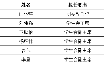 根据《四虎 共青团改革方案》、《四虎 学生会章程》,经自由报名、面试考察等环节,现将四虎 第九届团委、学生会主要学生干部预备人选名单予以公示:(排名不分先后)