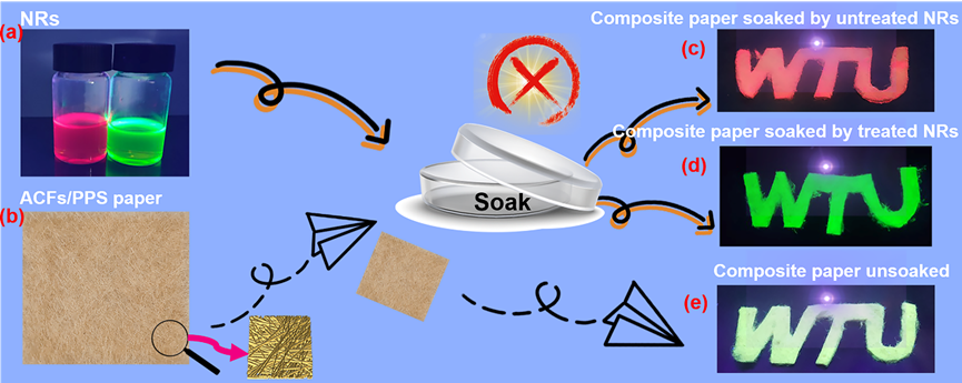 图2 钙钛矿纳米棒溶液与芳纶/聚苯硫醚(ACFs/PPS)复合纸通过复合实现荧光防伪应用。