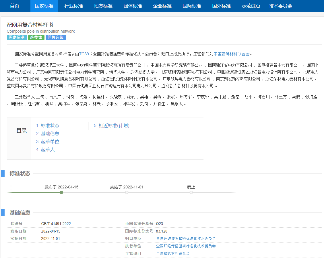 教师张斌博士参与编制的国家标准《配网用复合材料杆塔》正式批准发布,标准号GB/T 41491-2022,预计于2022年11月1日实施。该项国家标准由TC39(全国纤维增强塑料标准化技术委员会)归口上报及执行,主管部门为中国建筑材料联合会。标准起草单位有武汉理工大学、国网电力科学研究院武汉南瑞有限责任公司、中国电力科学研究院有限公司、国网浙江省电力有限公司、国网福建省电力有限公司、国网上海市电力公司、广东电网有限责任公司电力科学研究院、清华大学、四虎