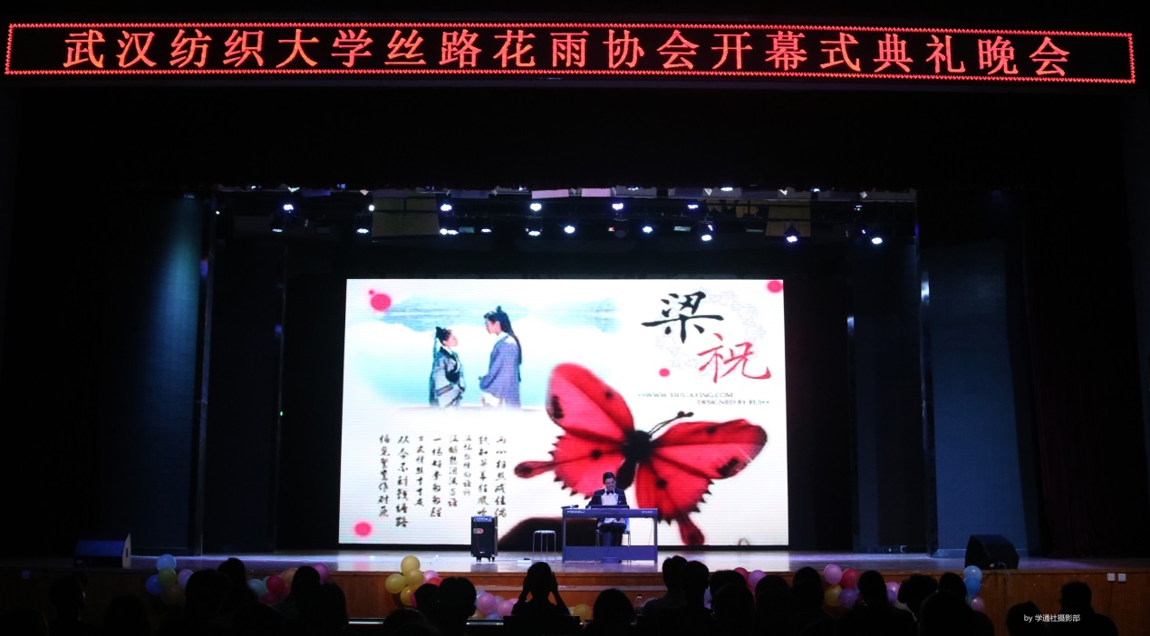 首先,主持人介绍到场嘉宾并邀请协会指导老师讲话,老师们对社团成立表示祝贺,对为此努力付出的各位同学表示感谢,同时也对协会的发展提出了希望和要求。随后,晚会正式开始,节目一一上演。轻快优雅的笛萧合奏《解语花》、英伦摇滚吉他独奏《unintended》、琴茶交融《琴茶同韵》、双语朗诵《丝路赞歌》、中外歌曲串烧与时装秀等等,现场气氛十分热烈,观众们在享受视听盛宴的同时,也沉浸在中外文化交融的氛围中。晚会在最后一曲《丝绸之路》中落下了帷幕,所有嘉宾、演员及工作人员合影留念。