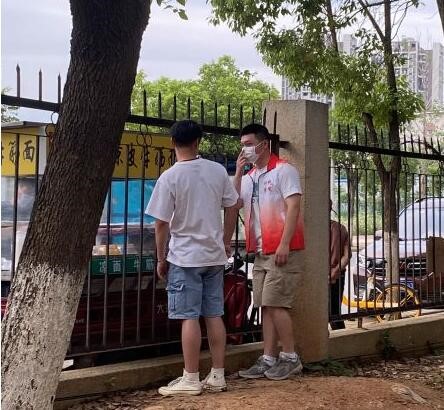 毕业生党员积极报名参加校园疫情防控巡逻志愿服务活动,提醒正在校园围栏处购物的同学们戴好口罩、做好个人防护。