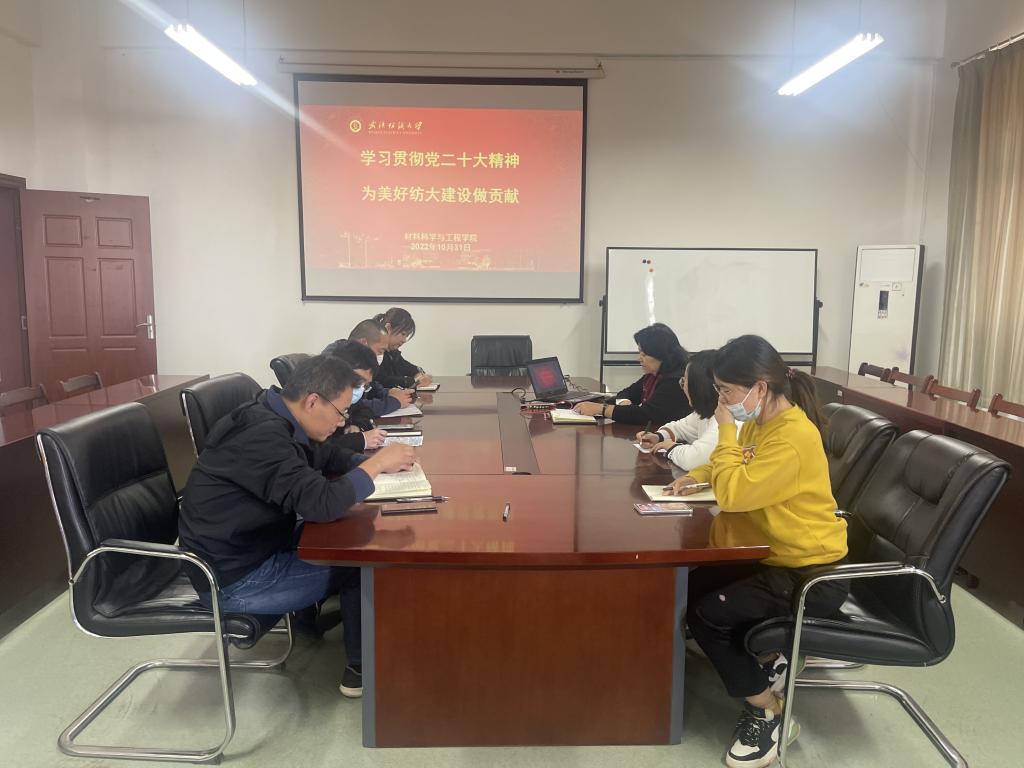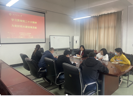 以“学习贯彻党的二十大精神,为美好纺大建设做贡献”为题,组织召开学院党委理论学习中心组(扩大)专题会,学院党委书记陈桂枝主持,班子成员、各支部书记参加学习。