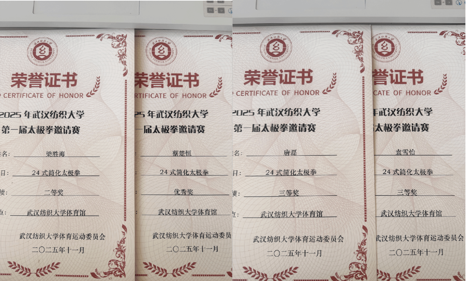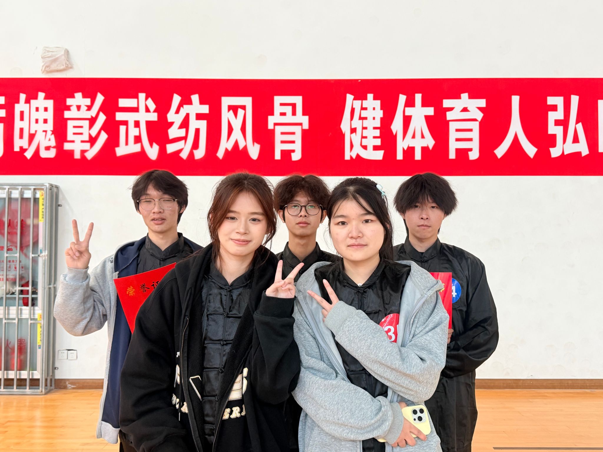 首届太极拳个人赛落幕。材料12503班唐磊、蔡楚恒,材料12505班班梁胜海,材料12506班陈可欣,材料12507班班袁雪怡等五名同学代表四虎
