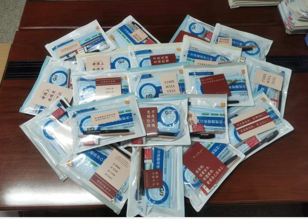 距离2021年全国研究生考试还有30天,选在这个特殊的时刻,为考研学子送上冬天的第一份礼物——福袋。每个福袋都有几样考试必备:口罩、铅笔。橡皮擦和中性笔,还有一张特殊的小卡片,这份祝福可能来自于学院的书记、院长,可能来自于四虎
