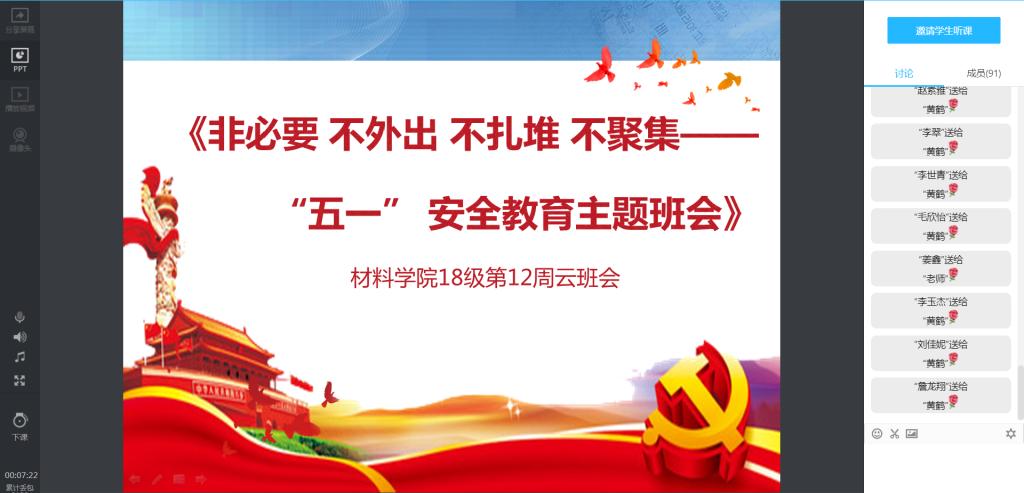 17 、18、19级年级大会上,各年级辅导员黄鹤、祝捷老师引导同学们充分认识当前疫情的严峻形势,做好个人防护,并继续坚持做好“日报平安”制度,并再次强调“非必要不外出,未经通知不得返校”等注意事项。