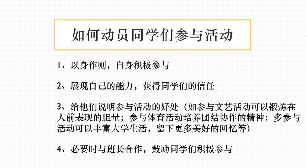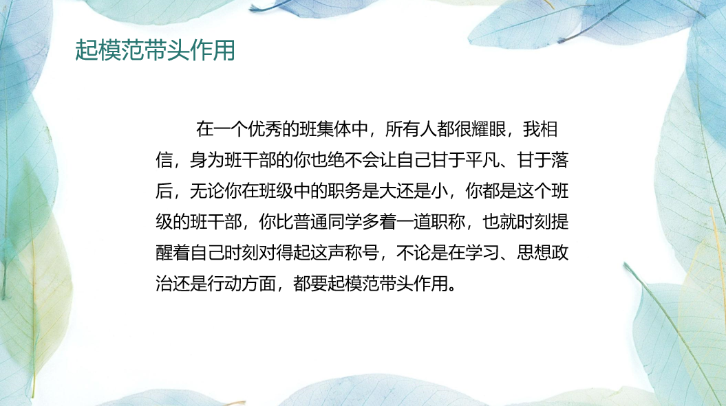 分享结束后,大家还就十佳班团建设等进行了深入交流。最后,曾老师作了总结发言,对班委提出要担当、互助、不轻言放弃等要求,最后强调了第二课堂学分的重要性,班委要精心谋划、带领班级同学通过参加各种活动充实大学生活,全面提升综合素质。