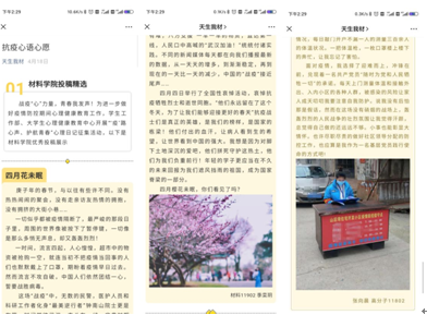 微信公众号“天生我材”开展“‘疫’路心声、护航青春”心理日记征集活动。大家通过心理日记,分享交流各自的战“疫”故事,探索对生命和人生的思考,寄托材料学子对祖国和人民的热爱,对父母家人的深情,和对自己全新的期许。