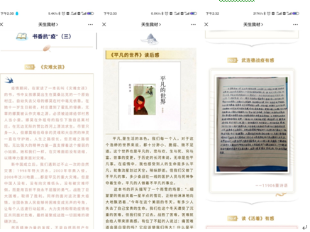 同时,为了配合学院的学风建设工作,让同学们不落下宅家学习的进度,“心语心园”通过“天生我材”微信公众号开展“书香抗疫”读后感收集活动和学霸心得分享。同学们纷纷交流分享了自己宅家期间阅读书籍的读后感,学霸们则分享了关于线上学习的心得方法和读书笔记,辅导员黄鹤老师和祝捷老师频频为他们点赞打call。