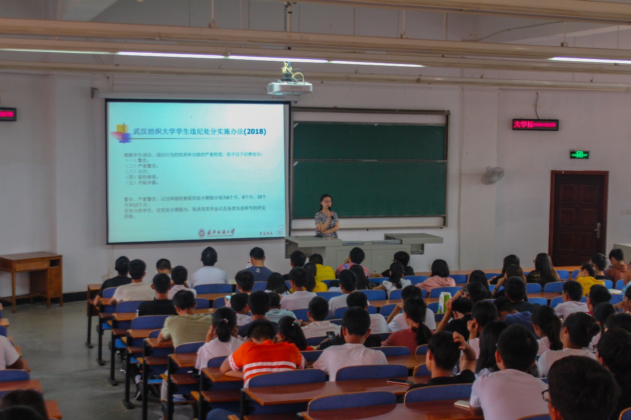 9月30日上午,2018级新生辅导员黄鹤老师为2018级新生详细讲解了学籍管理、奖助学金、日常管理相关规定等。黄老师重点介绍了转专业,休学,退学,重修的问题、学分的构成,选课的问题、大学生管理规定、本科生考勤及请假管理方法、每周班会及晚点名工作、大学生综合测评积分实施办法、本专科学生国家助学金评选管理办法、本专科家庭经济困难学生认定工作实施办法这八个方面,使新生对大学的规章制度有了一个全面的认识。