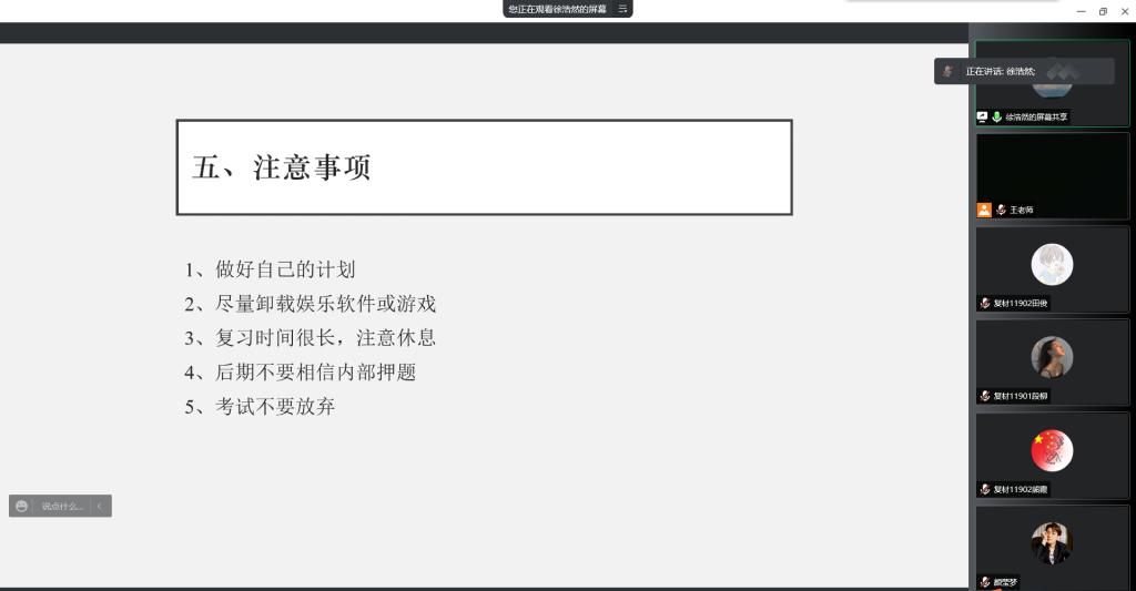 接着四位主讲人依次分享考研经验,刘雅霜分科目分别给同学们详细介绍看哪个版本的书、哪位老师的课程,同时提醒大家,注意利用好暑假的时间,做好整体规划,按计划推进;徐浩然分享了自己考研的时间规划,针对数学和高分子化学详细讲解了复习内容,最后给同学们提了五点建议,做好规划、卸载娱乐软件、注意休息、不要相信内部押题、考试坚持考完;颜莹梦介绍了南京邮电大学的招生目录及获取信息的方式,告诫同学们,认真学习四虎