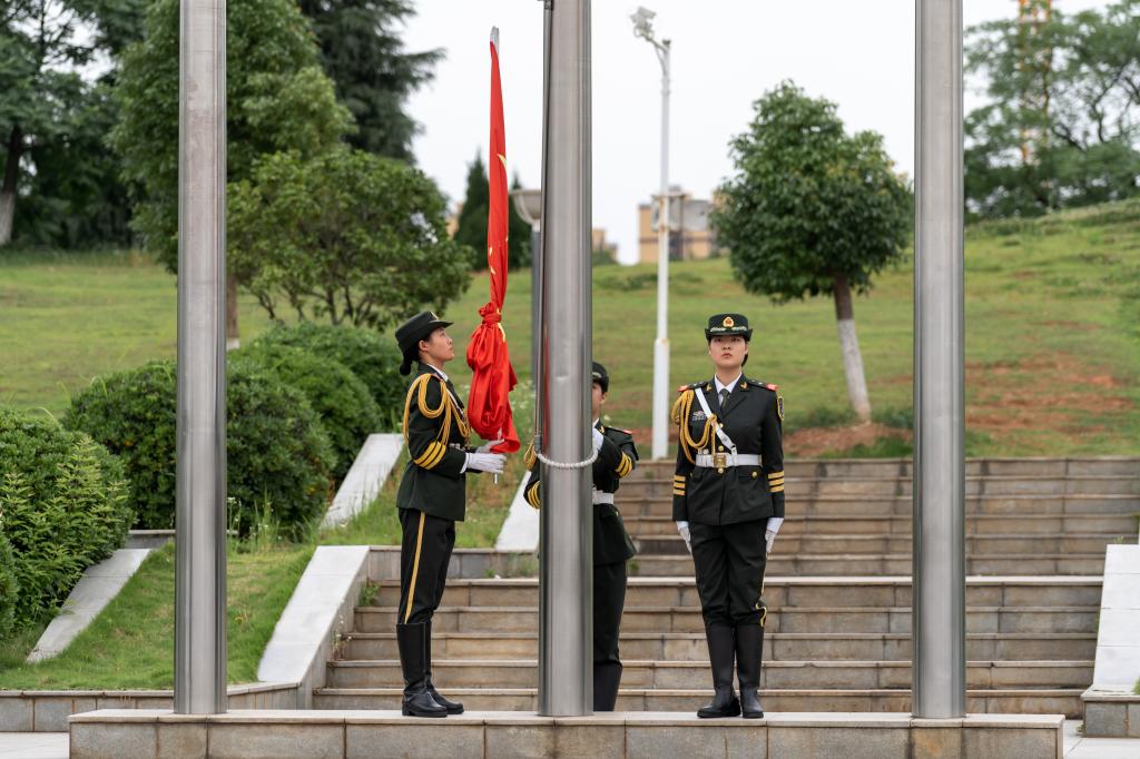 升旗仪式在7点00分准时开始。国旗护卫队擎旗手、护旗手方阵踏着铿锵有力的步伐,将国旗庄严地护送入场。升旗手振臂一挥,鲜艳的五星红旗迎风舒展,徐徐升起。带着对祖国无限的热爱和崇高的敬意,全体师生庄严肃立,行注目礼,唱国歌。
