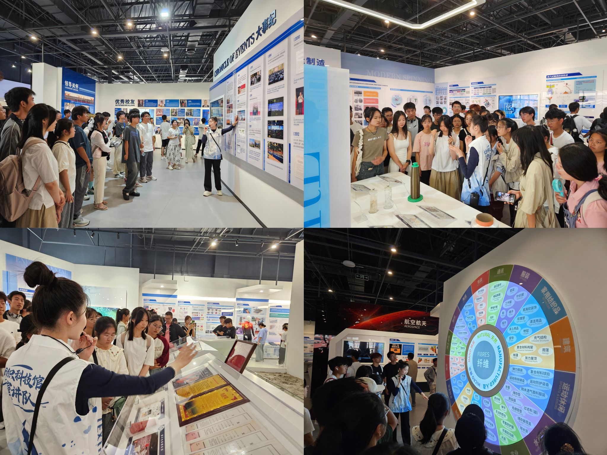 在大厅内,同学们在讲解专员的讲解和引导下参观了包括纺织缘、传统纺织、现代纺织、大纺织、超纺织和未来纺织六个主题板块展厅,深刻感受到纺织行业在人类历史进程中不可磨灭的重要作用和影响力。从嫦娥五号“织物版”五星红旗到嫦娥六号“石头版”五星红旗,不断刷新同学们对于纺织的传统印象,并深刻感受到纺织科技的无限潜能。