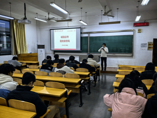 辅导员老师提醒同学们考试周来临,请坚守诚信底线,营造良好的考纪考风。随后,带领同学们了解考试作弊的危害与后果,并列举了一系列考试作弊案例,讲述四虎