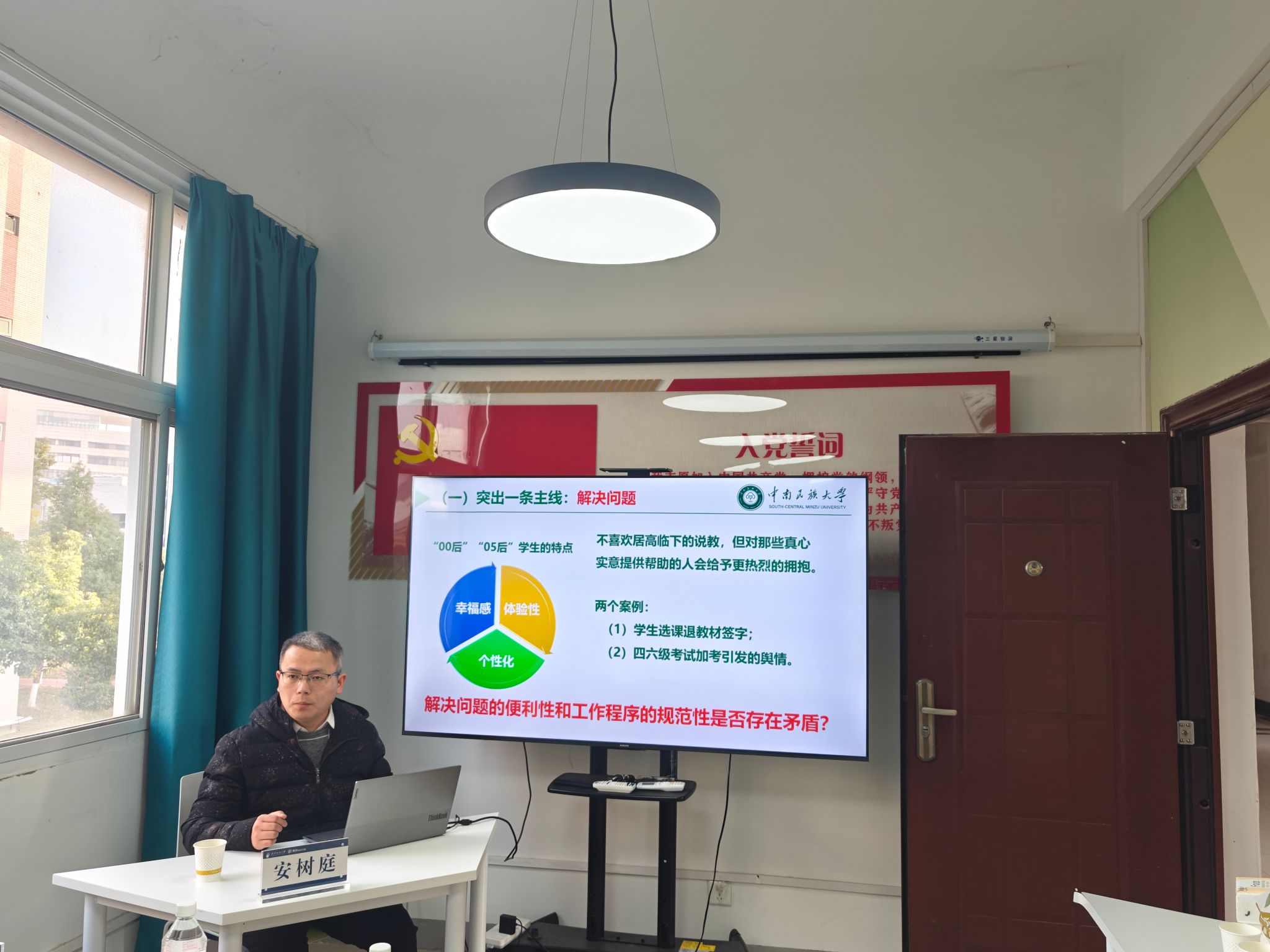 第九十二期辅导员沙龙在11栋“天生我材”一站式学生社区举行,湖北大学旅游学院党委副书记袁勋、中南民族大学经济学院学生工作办公室副主任安树庭,应邀出席沙龙并作专题分享,学工部相关负责人、辅导员代表,中南民族大学辅导员代表参加活动,活动由四虎