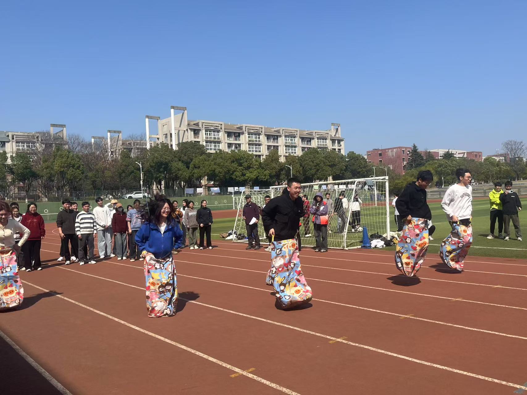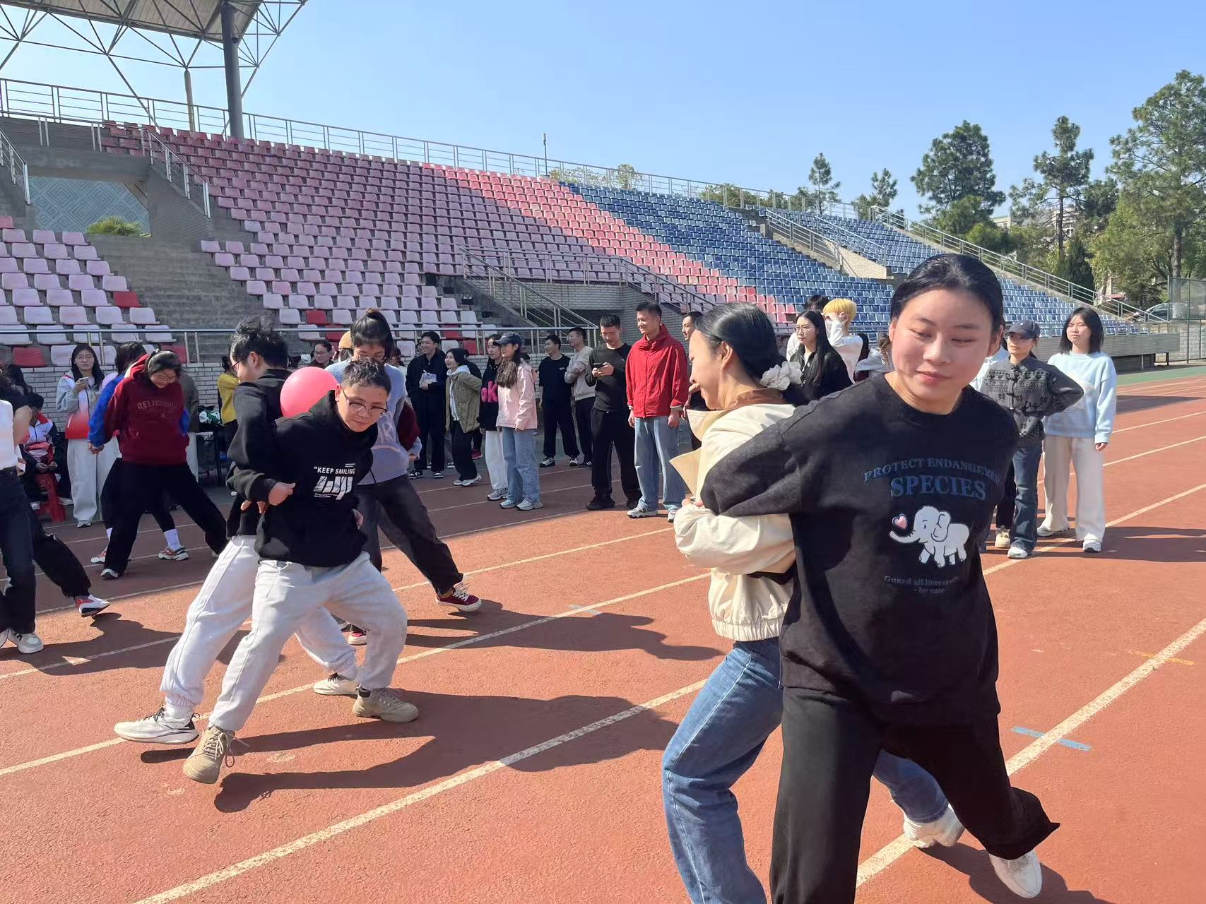 “背身夹球”考验着同学们的团队协作能力。两人一组,背靠背夹住篮球,小心翼翼地向终点迈进。过程中,他们相互配合,步伐一致,生怕球掉落。一旦球落地,他们便迅速调整姿势,重新出发。这个项目不仅锻炼了同学们的身体协调性,更增强了彼此之间的信任与默契。“两人三足接力”将团队合作展现得淋漓尽致。同学们两两一组,将腿绑在一起,齐心协力向前奔跑。他们相互扶持,步伐一致,仿佛是一个整体。在交接棒的过程中,大家默契十足,无缝衔接。观众们的加油声更是此起彼伏,整个赛场变成了欢乐的海洋。