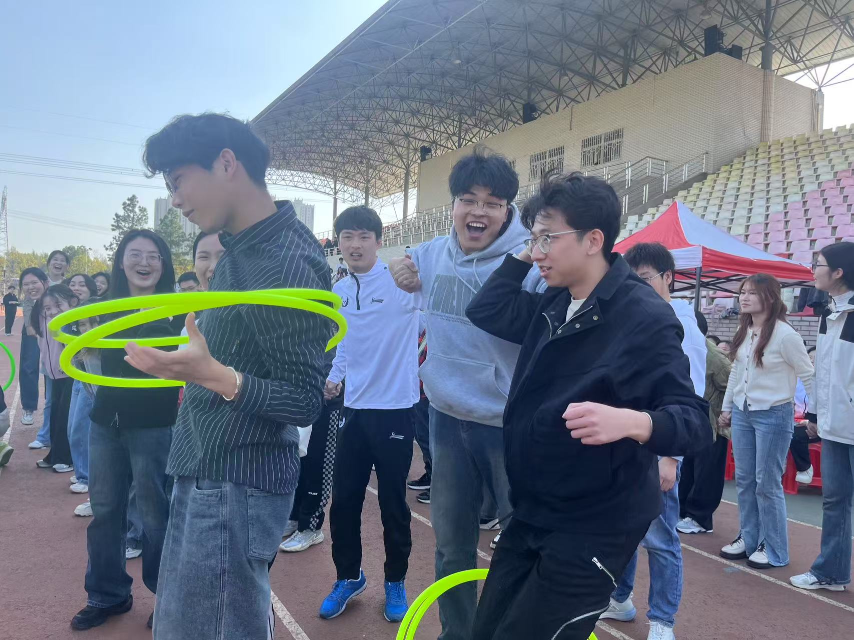 活动项目精彩纷呈,在“一圈到底”项目,同学们手持呼啦圈,迅速排成一列。随着比赛开始的哨声响起,呼啦圈在队伍中快速传递,大家紧密配合,眼神专注,手忙脚乱中又透着默契,现场不时爆发出阵阵欢呼声。紧接着的“鸿运当头”环节,同学们头顶气球,小心翼翼地在赛道上前行。气球的晃动、同学们的笑声交织在一起,构成了一幅欢乐的画面。气球一旦掉落,同学们便迅速捡起,继续投入比赛,彼此之间相互鼓励,毫无怨言。