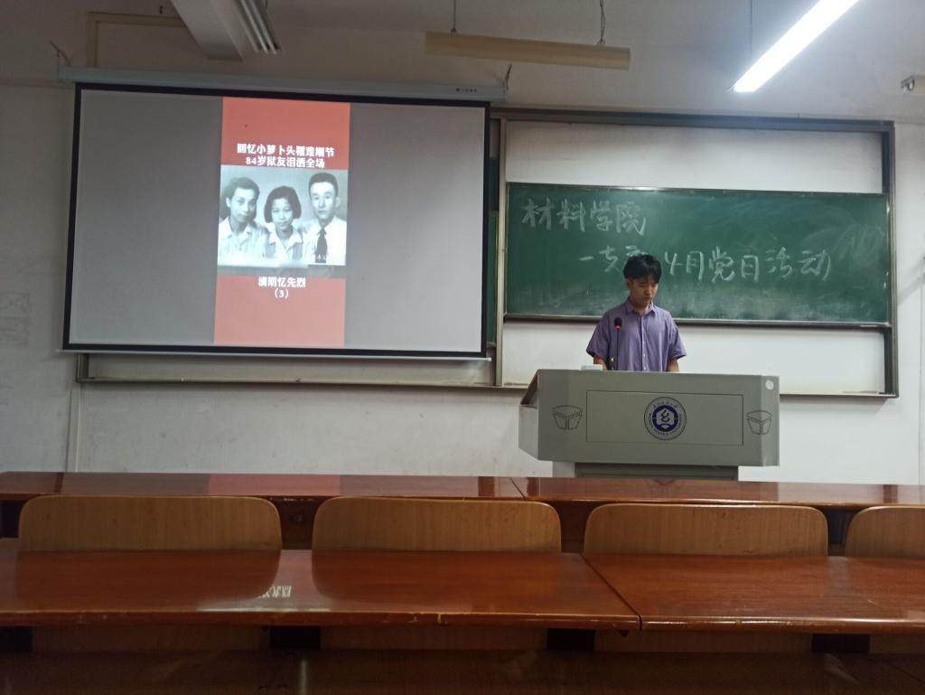 会上播放了党史学习视频——《清明忆先烈(3)》,讲述了李碧涛老人回忆中国年龄最小的烈士——小萝卜头(原名宋振中)的狱中故事,与会人员很受感触。学生二支部书记毛成兴老师以小萝卜头对自由的渴望和对知识的渴求,鼓励大家不断学习党史,从历史中汲取力量,努力成为堪当民族复兴重任的时代新人,让青春在为祖国、为民族、为人民、为人类的不懈奋斗中绽放绚丽之花。