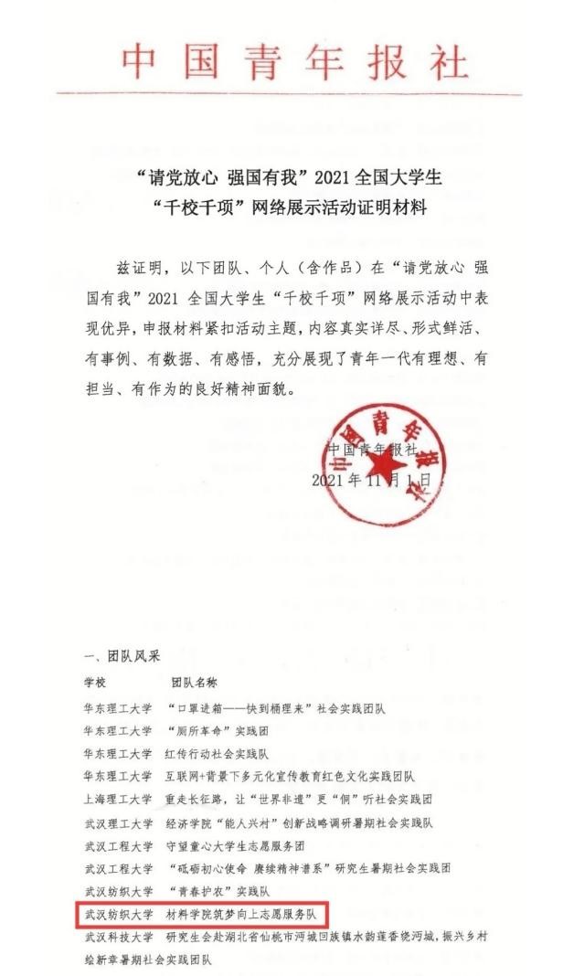 据悉,全国大学生“千校千项”网络展示活动是由共青团中央宣传部指导,中国青年报社、中青在线共同主办的比赛,旨在引领广大青少年学生在社会实践中受教育、长才干、做贡献,鼓励广大青少年走进基层,投身祖国事业建设中去。该活动自2020年8月启动以来便得到广大青年学生的积极参与,在各高校掀起基层实践服务热潮。本次活动共收到了14220份材料,全国评选出500支团队入选最优“团队风采”、300项优秀“个人事迹”。