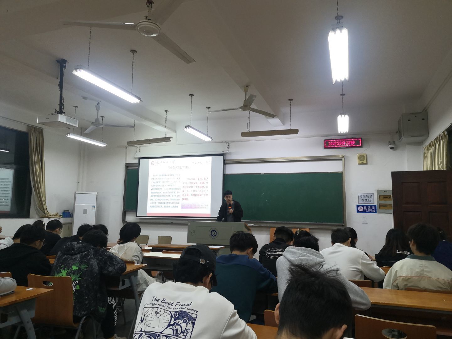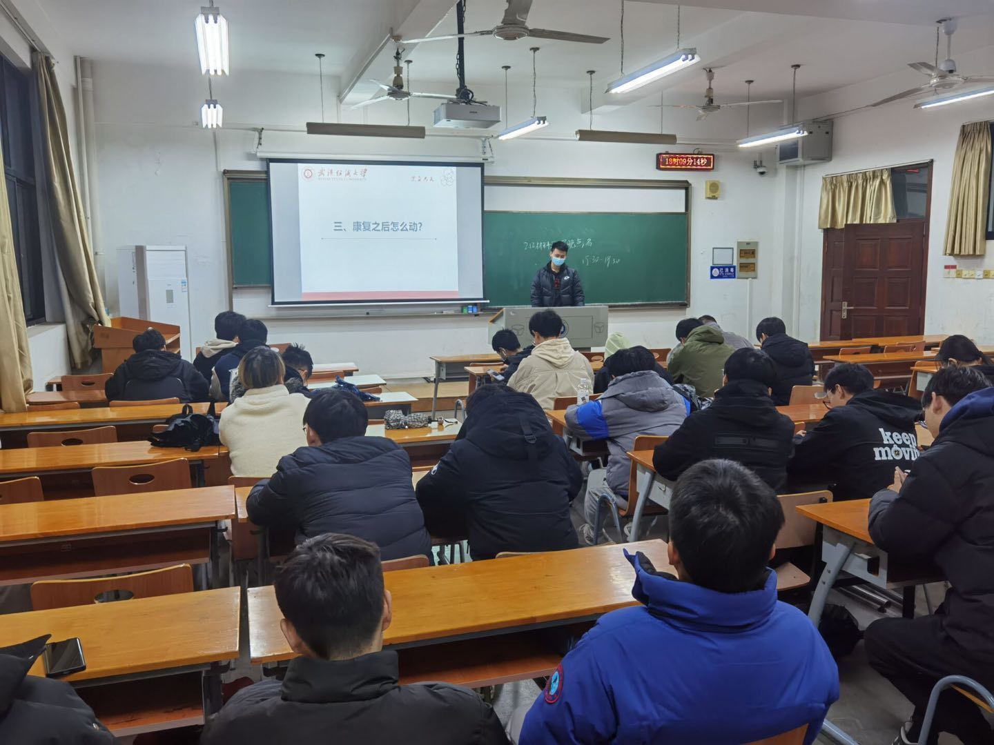 新型冠状病毒感染疫情防控操作指南》,讲解了校园疫情防控的具体要求和个人防疫指南,学习了日常传染病防控知识和技能,并重点学习了感染新冠康复后的恢复方法,提醒同学们树立“每个人是自己健康第一责任人”的意识。班会上,还进行了防范电信诈骗、开学心理调适、考试诚信等学习,鼓励同学们积极调整状态,积极参加第十八届挑战杯比赛提升自我。