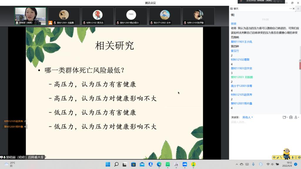 随后,郭老师向同学们介绍了压力的界定,并让同学们思考自己的价值观,同时结合自身实例向同学们进行讲解和介绍,倡导同学们找出属于自己的价值观,积极转变心态,将压力转化为前进动力。对于如何打造心理免疫力这个问题,郭老师介绍了两种认知调整理论,同时也以亲身经历的事情进行传授,引导同学们端正心态,积极调适,将负面描述转化为正向目标,通过人际联结找到人生的意义。最后,郭老师提到,幸福人生并不等于轻松人生,最轻松的路或许是最难走的路,压力代表着新的可能性,鼓励同学们调整心态,正确看待压力,用有趣的态度走完这一生!